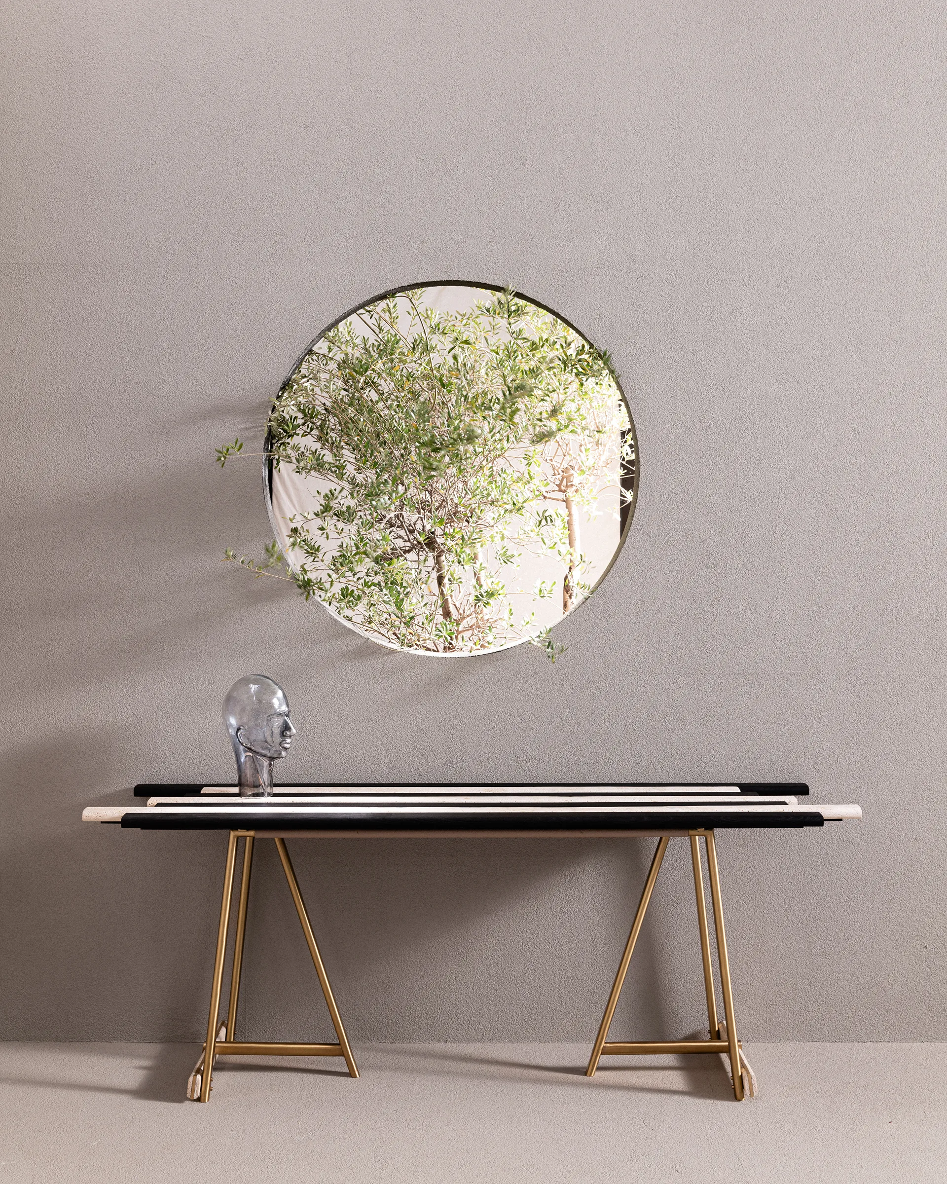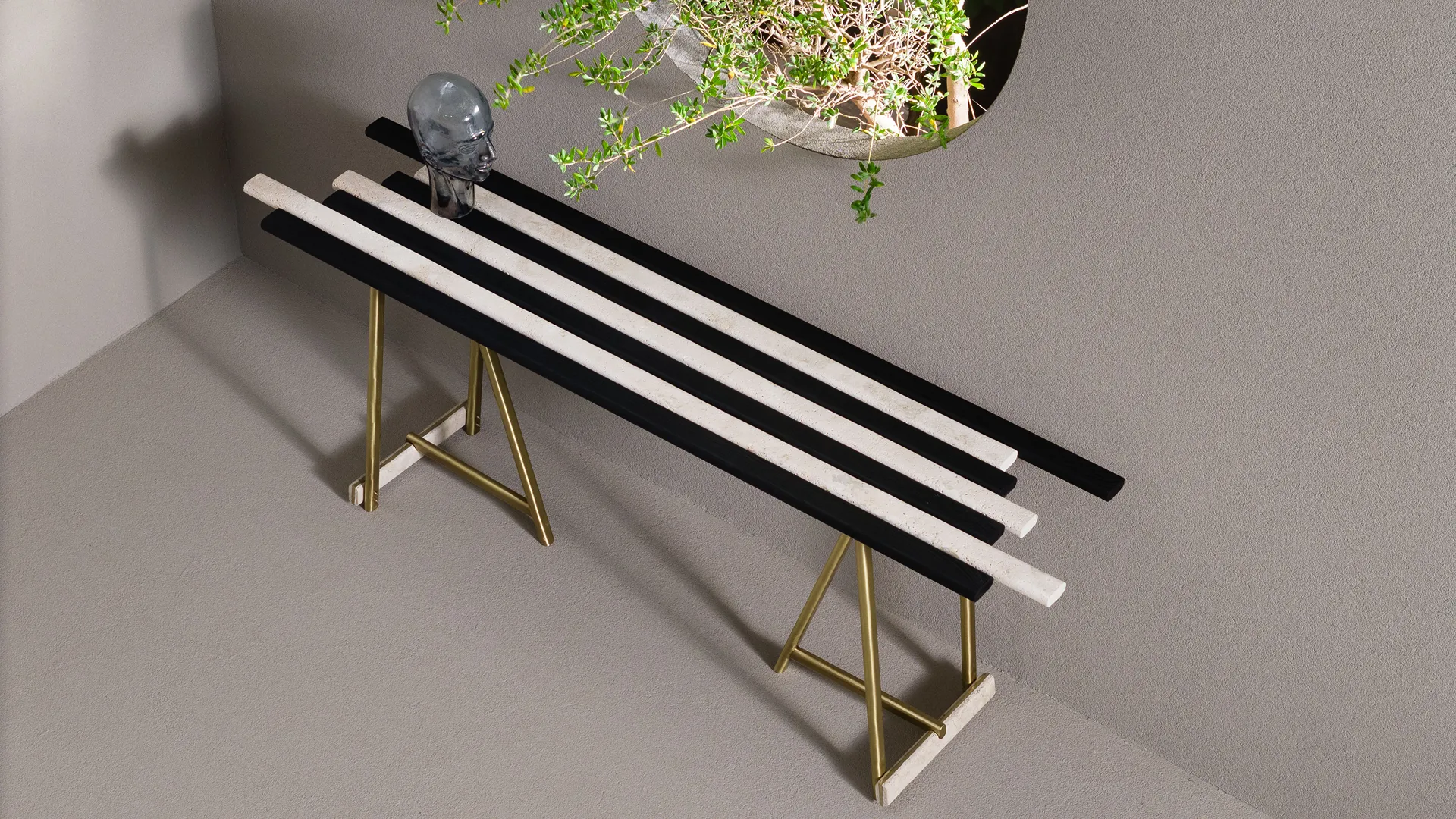 The Blade Console is a striking piece that masterfully combines material contrasts and dynamic design. Its linear repetition, disrupted by asymmetric lengths, challenges traditional symmetry, offering a bold and contemporary aesthetic. Inspired by abstract and functional art, the console seamlessly merges creativity with practicality. The sculptural brass base anchors the piece, providing balance to the dynamic top while adding a touch of timeless elegance. The Blade Console goes beyond just being a piece of furniture — it’s a functional work of art that elevates any interior with its innovative design and artistic flair.